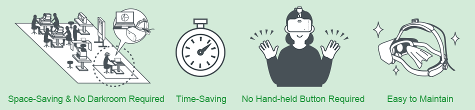 The tests are performed using a head-mounted device, eliminating the need to dim the room. Additionally, the device is compact and portable, enabling simultaneous testing of multiple individuals.