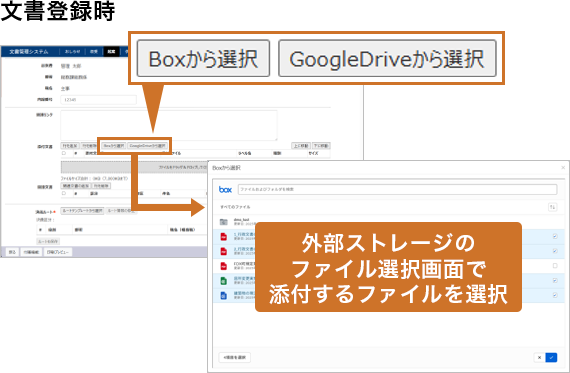 文書を修正する際も、修正したファイルを再度添付することなく、外部ストレージから最新版を取得することができます。