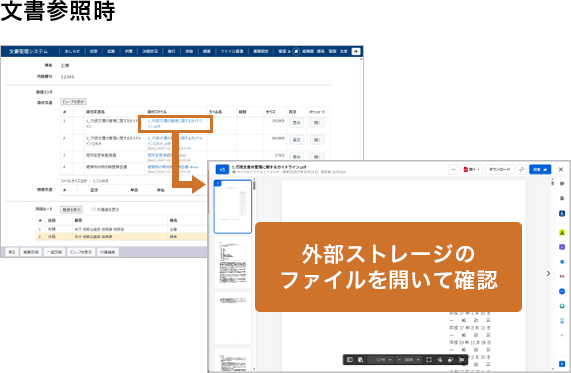 文書を参照する際には、文書名がリンクになっているので、クリックすることで外部ストレージにあるファイルを直接参照することができます。(※文書管理システムのビューア機能を用いて参照することもできます。)