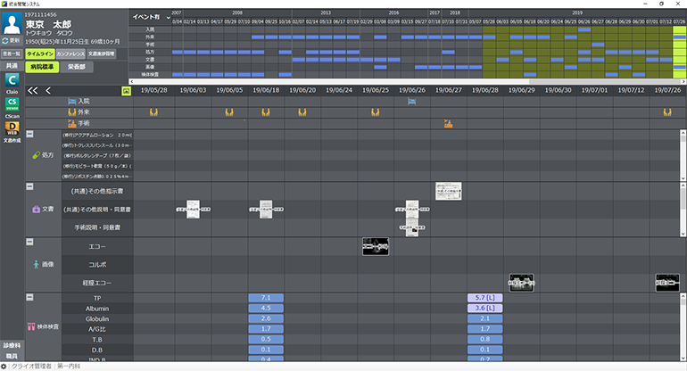 院内に散在する検査画像、検査結果、文書、処方、検体検査などの情報を集約し一画面に表示します。患者の情報を時系列で参照し、俯瞰すると共に、必要な情報を瞬時に把握することができます。